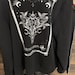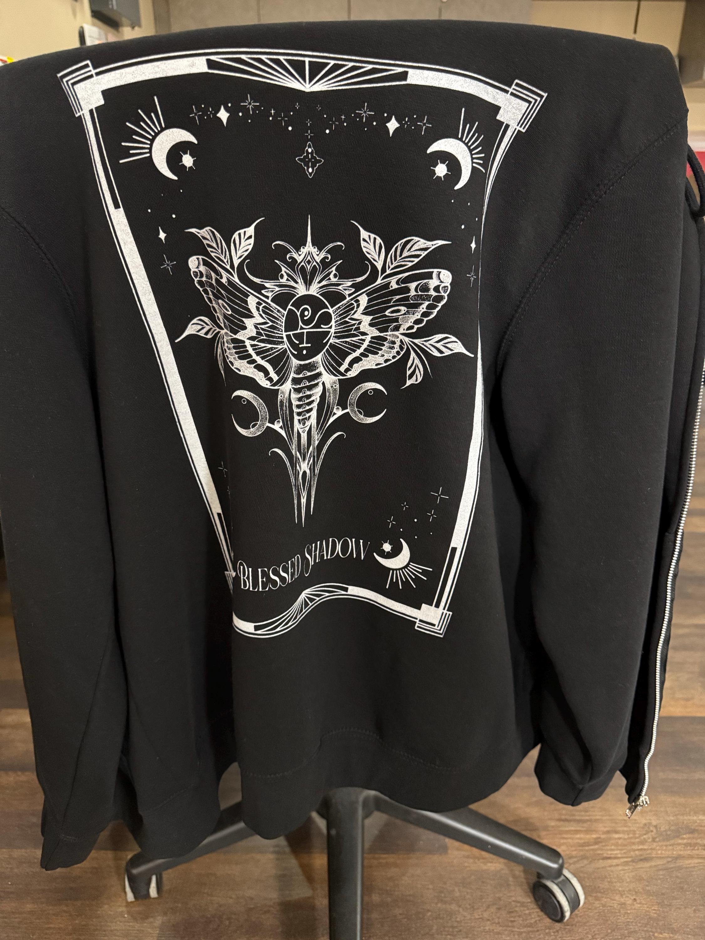 It features a hand drawn tarot card design with the Blessed Shadow logo on the back and a small emblem of the logo on the left corner of the chest.